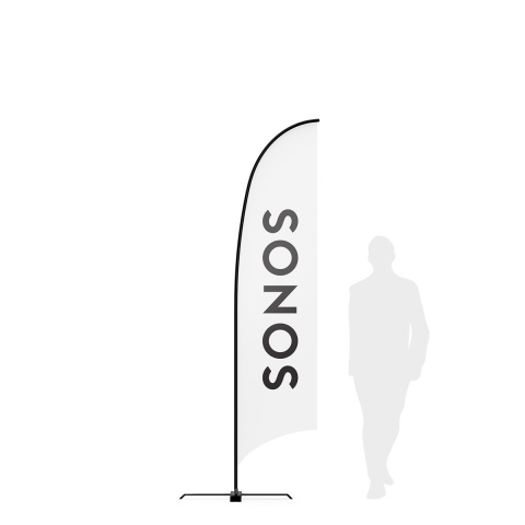 Beachflagga Small passar lika bra på vintern som på sommaren. Denna storlek är idealisk där takhöjd är en höjdbegränsning, t.ex. inomhus i butiker eller på mässor. Som standard använder vi ett 115gsm slätt tyg med genomgående tryck.