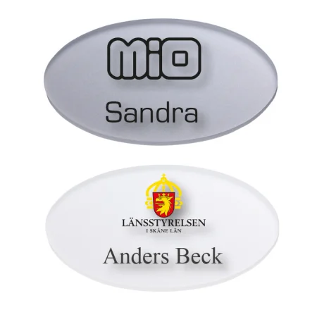 Skapa egna namnskyltar med ert namn, företagsnamn och logotyp. En snygg namnskylt med ditt tryck gör stor skillnad och ett bra intryck. Vi erbjuder namnskyltar med tryck i många olika utföranden.