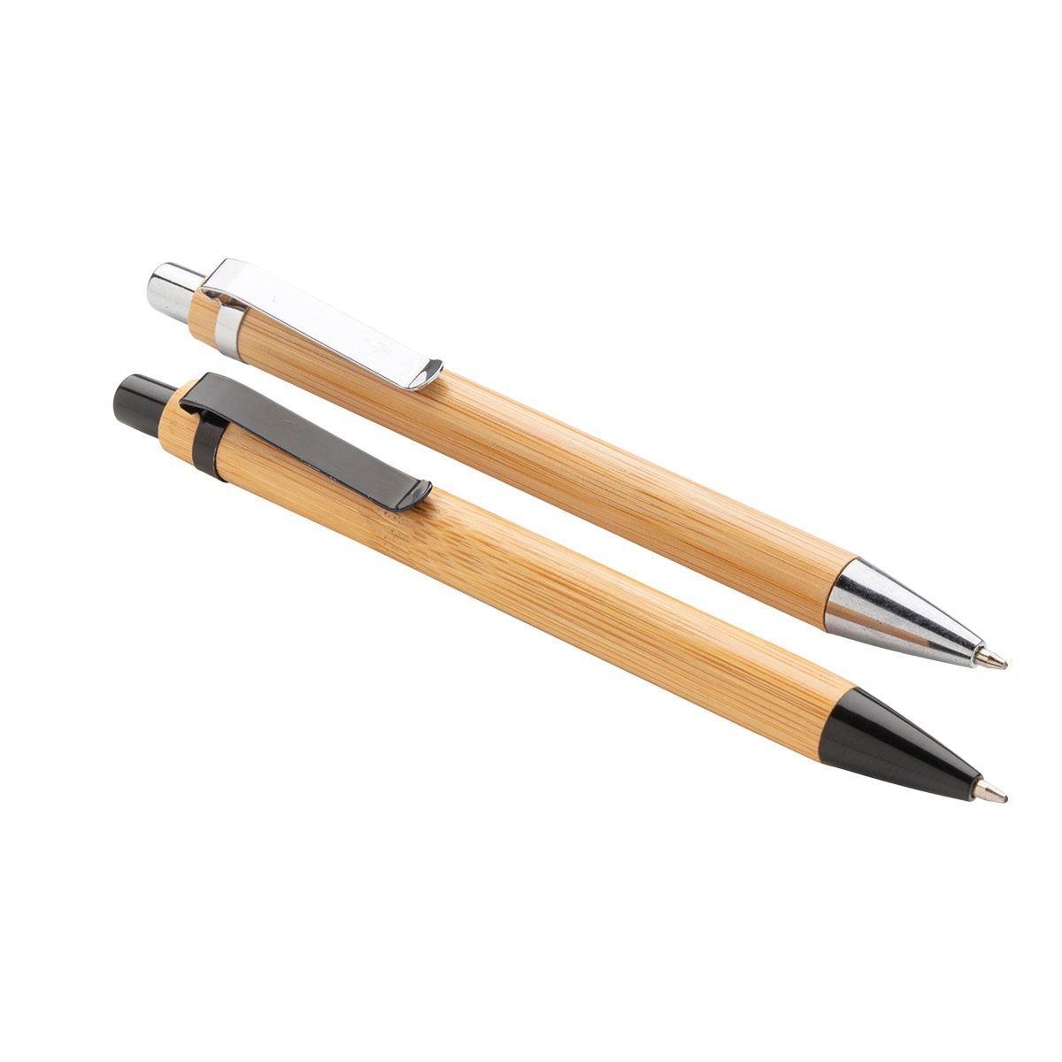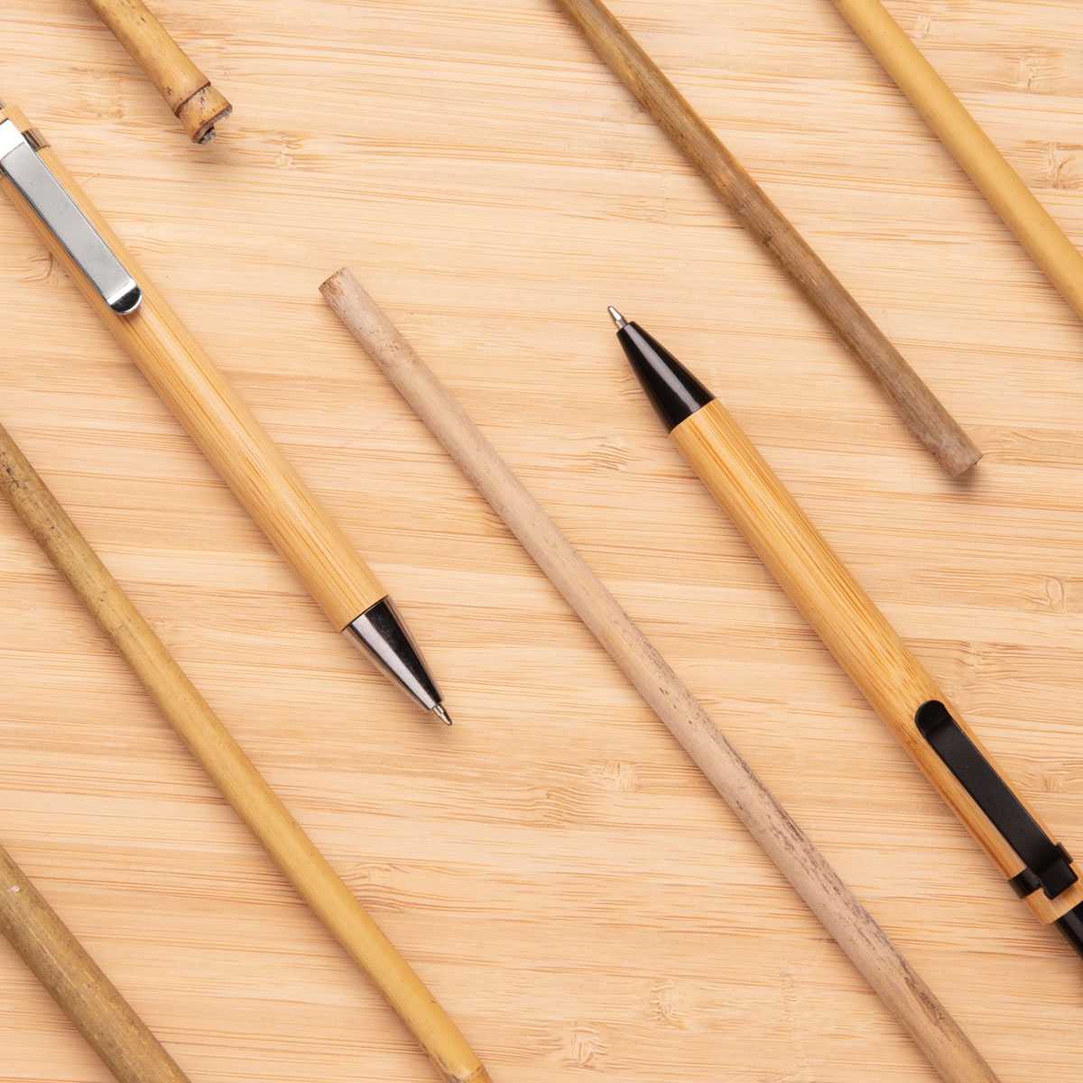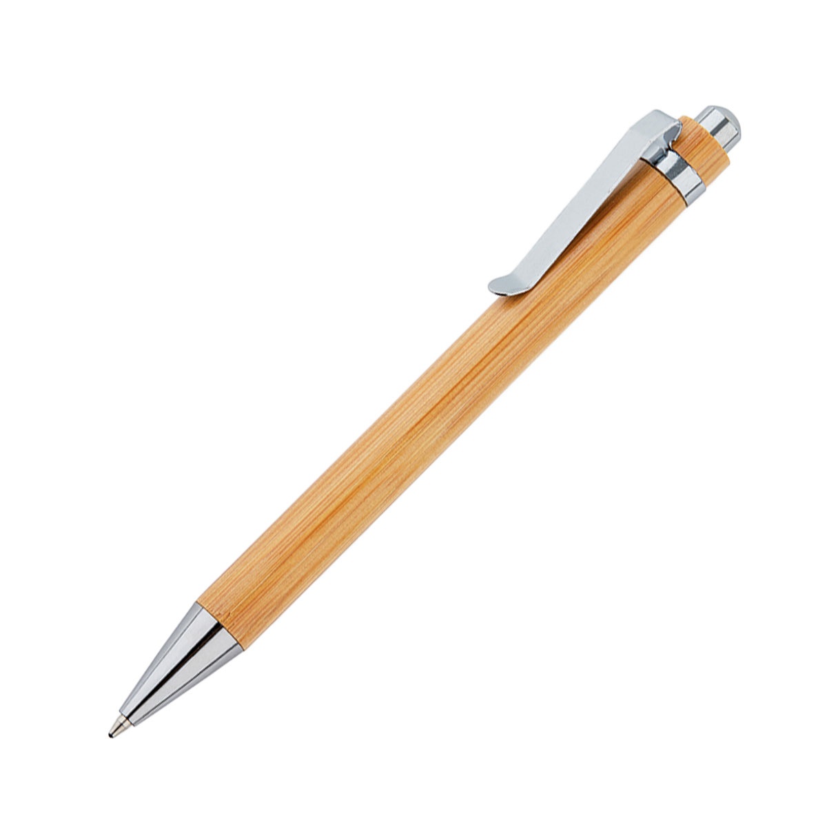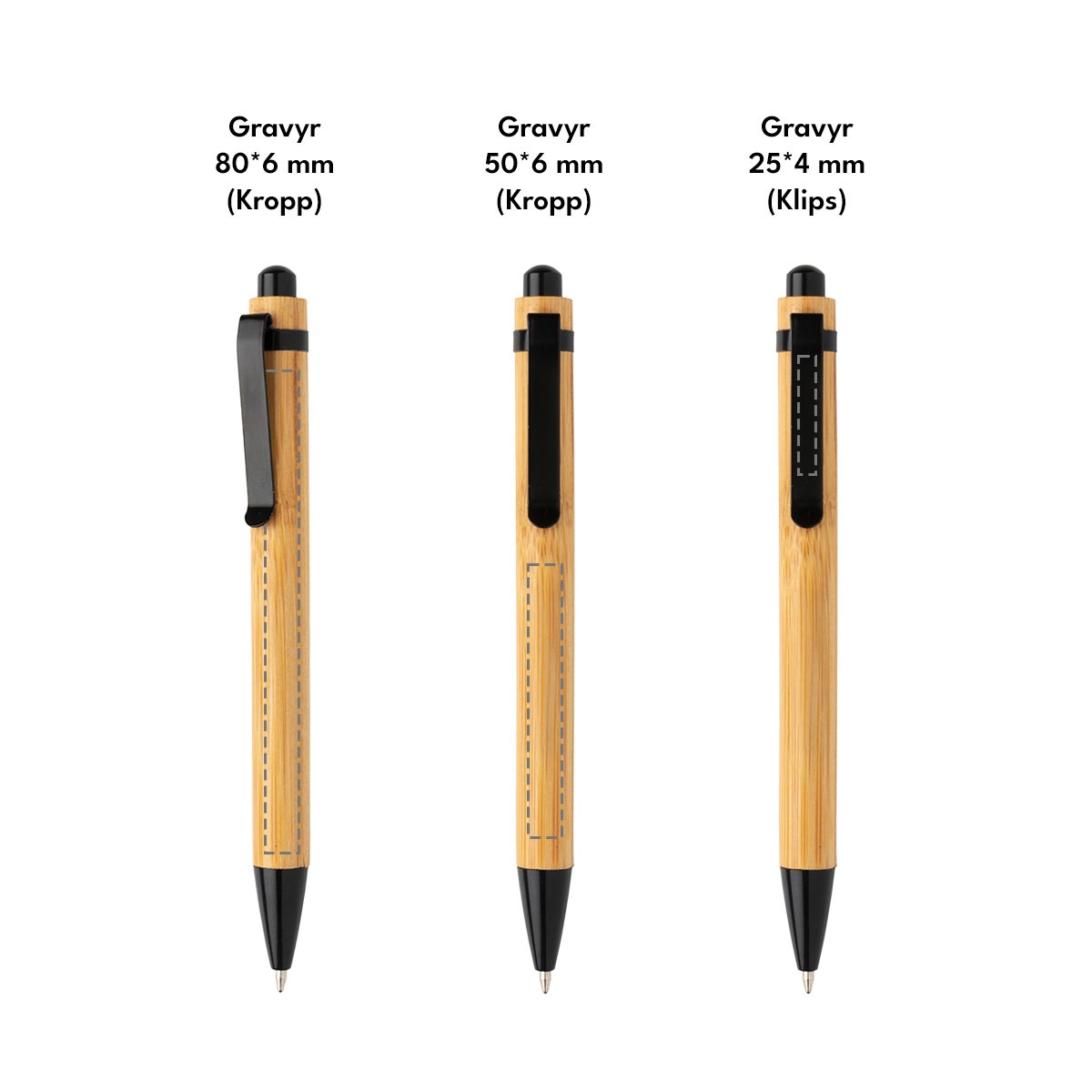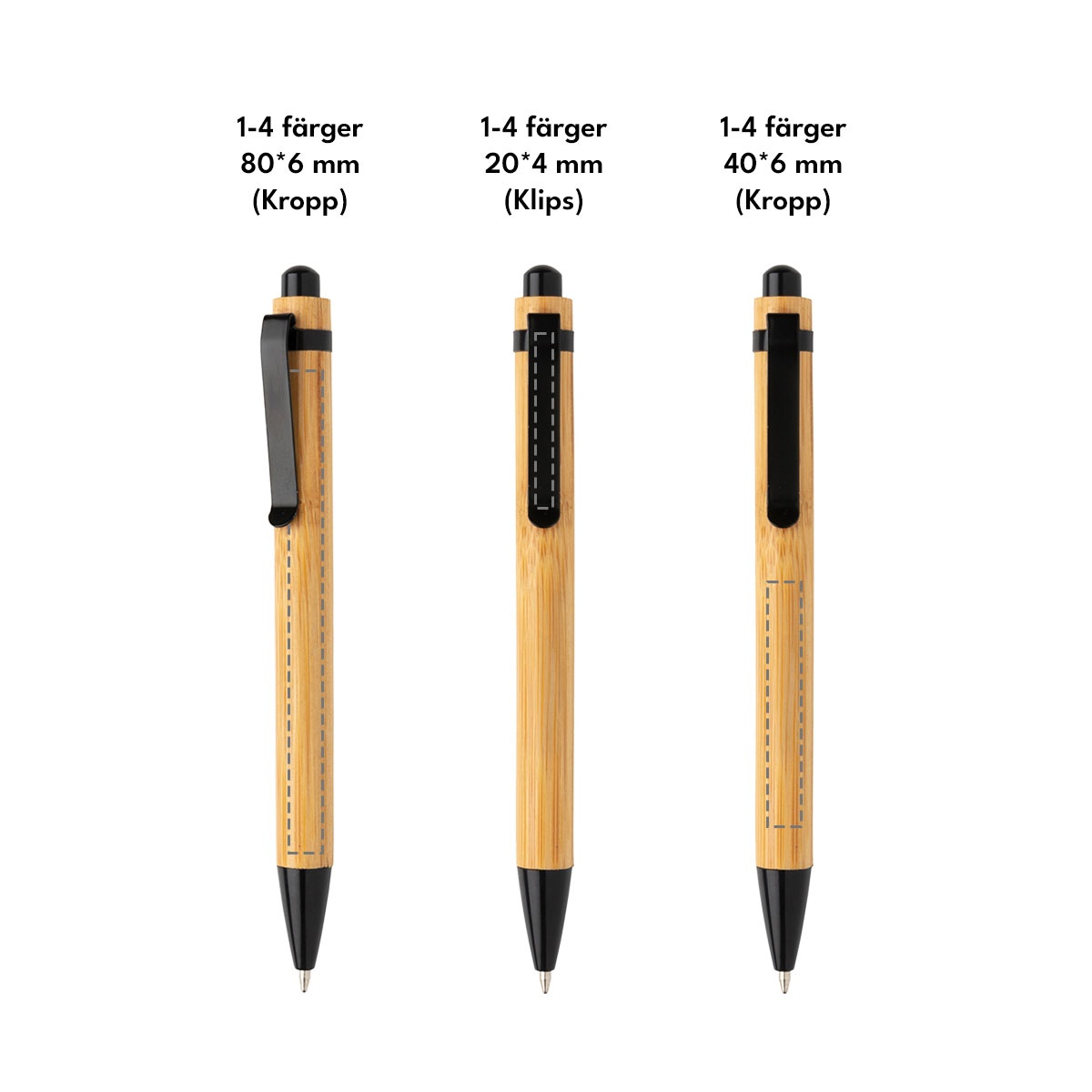 Reklampenna Bambu har en rustik och organisk känsla. Denna pennan är tillverkad i bambu och rostfritt stål. Pennan har svart bläck och finns i 2 olika färger.