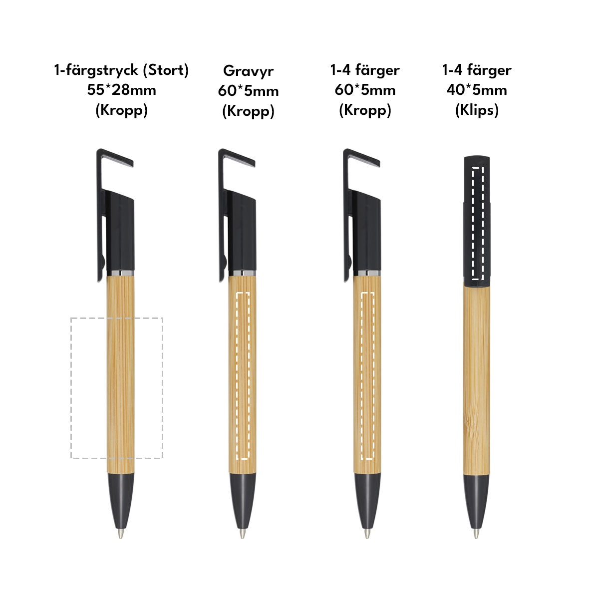 Välj mellan 1-4 färger, stort 1-färgstryck eller gravyr på pennans kropp. Vi erbjuder även 1-4 färgstryck på pennans klips.