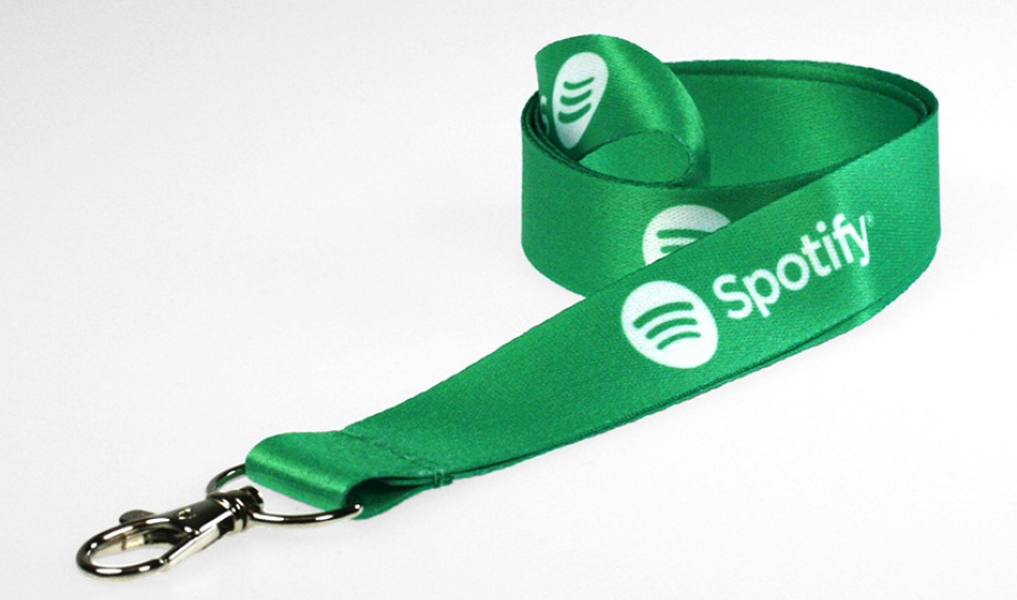 Digitaltryckta logoband har en skön silkeslen yta. I detta exempel har vi tryckt ett grönt nyckelband med vit logo.
