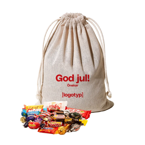 Godis levererade i en fin jutesäck tryckt med er företagslogo. Säcken utan tryck är både GOTS och GRS-certifierad. Fyll säcken med valfri godissmak och ge bort som julklapp till företagets anställda!