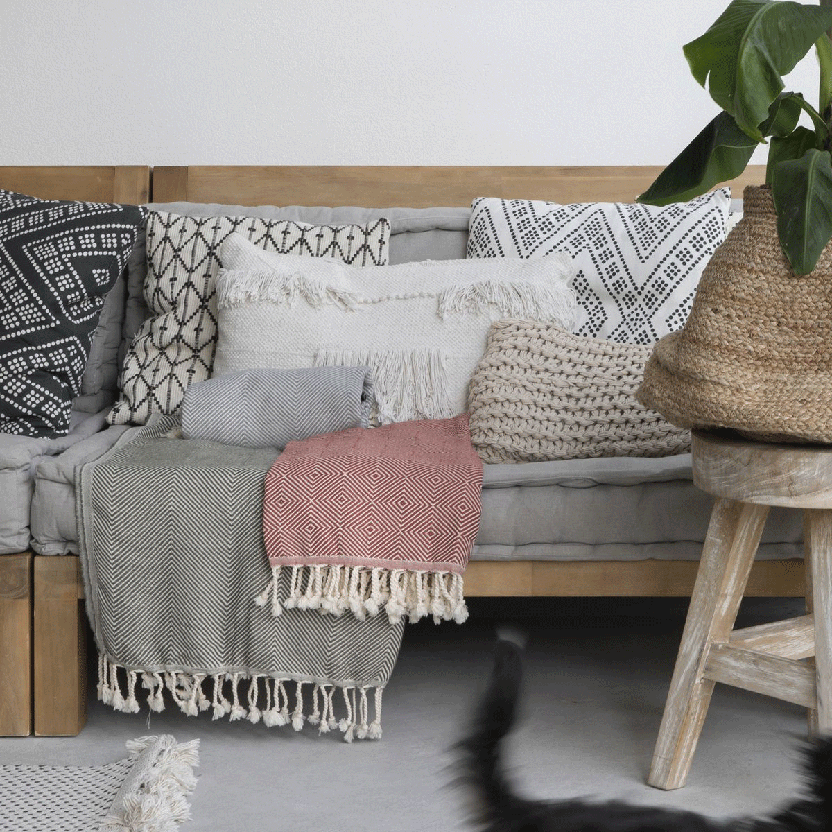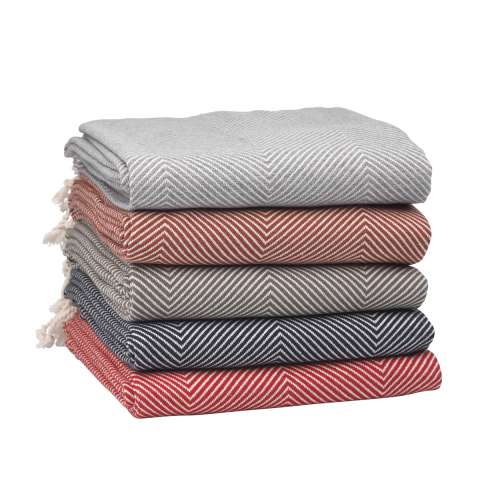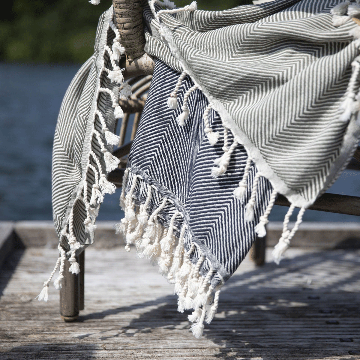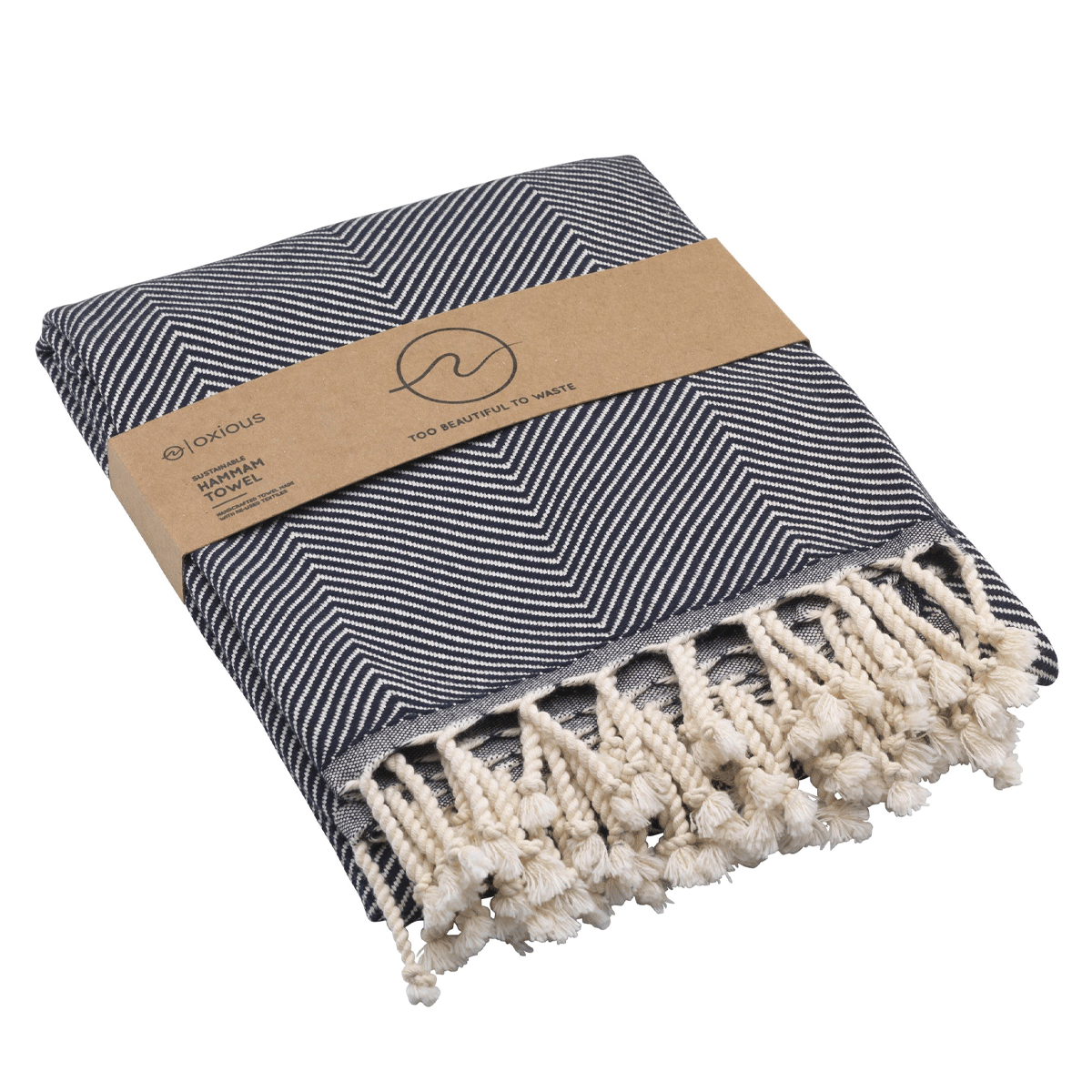 Vackra stilrena handdukar i fiskbensmönster från märket Oxious. Mjuka lyxiga handdukar som har fler användningsområden: går att använda som handduk, filt, bordsduk och picknickduk. Handdukarna är handgjorda och tillverkade med omsorg. Handdukarna är tillverkade av 92% OEKO-TEX-certifierad bomull (42% återvunnen) och 8% RPET. Storlek: 100x190cm.