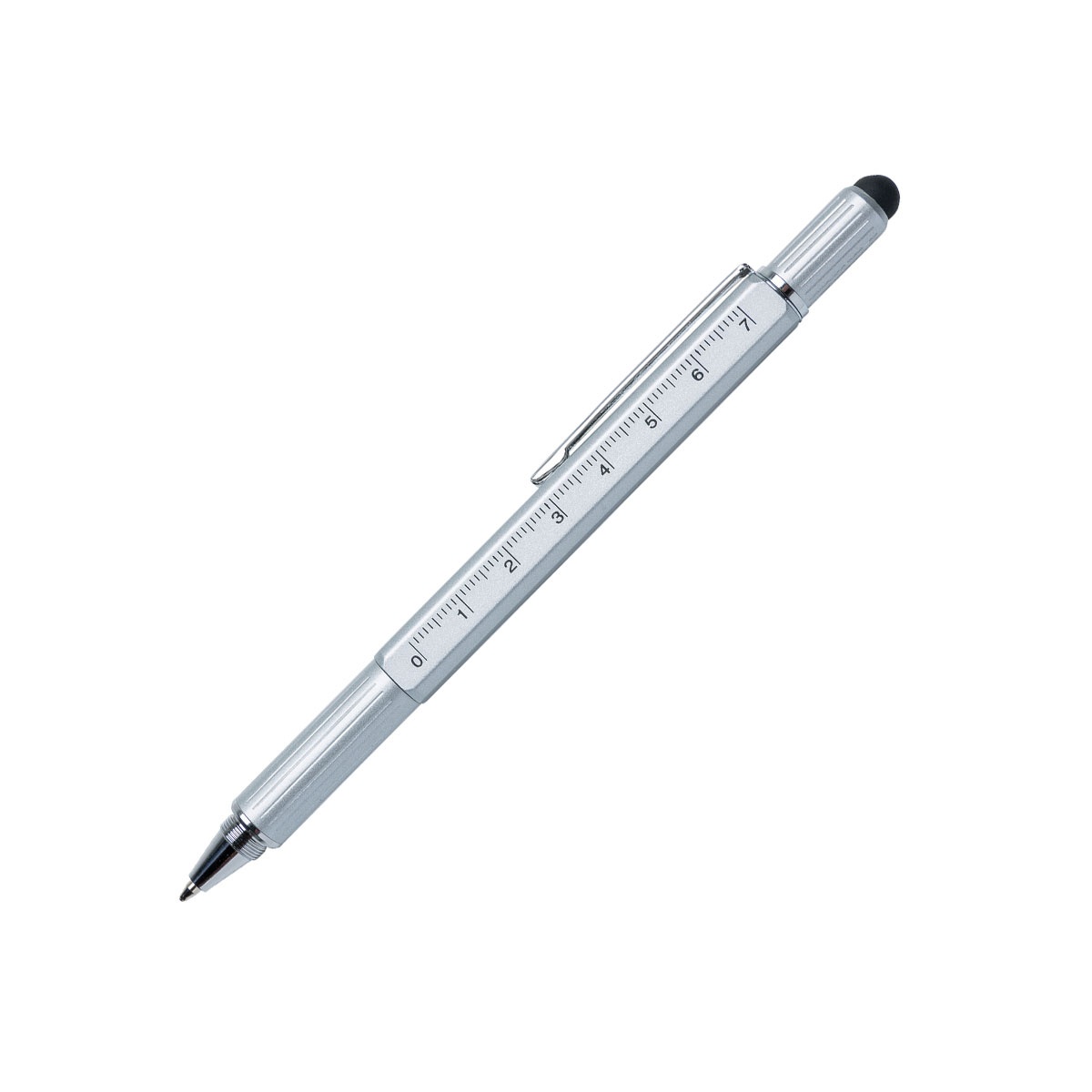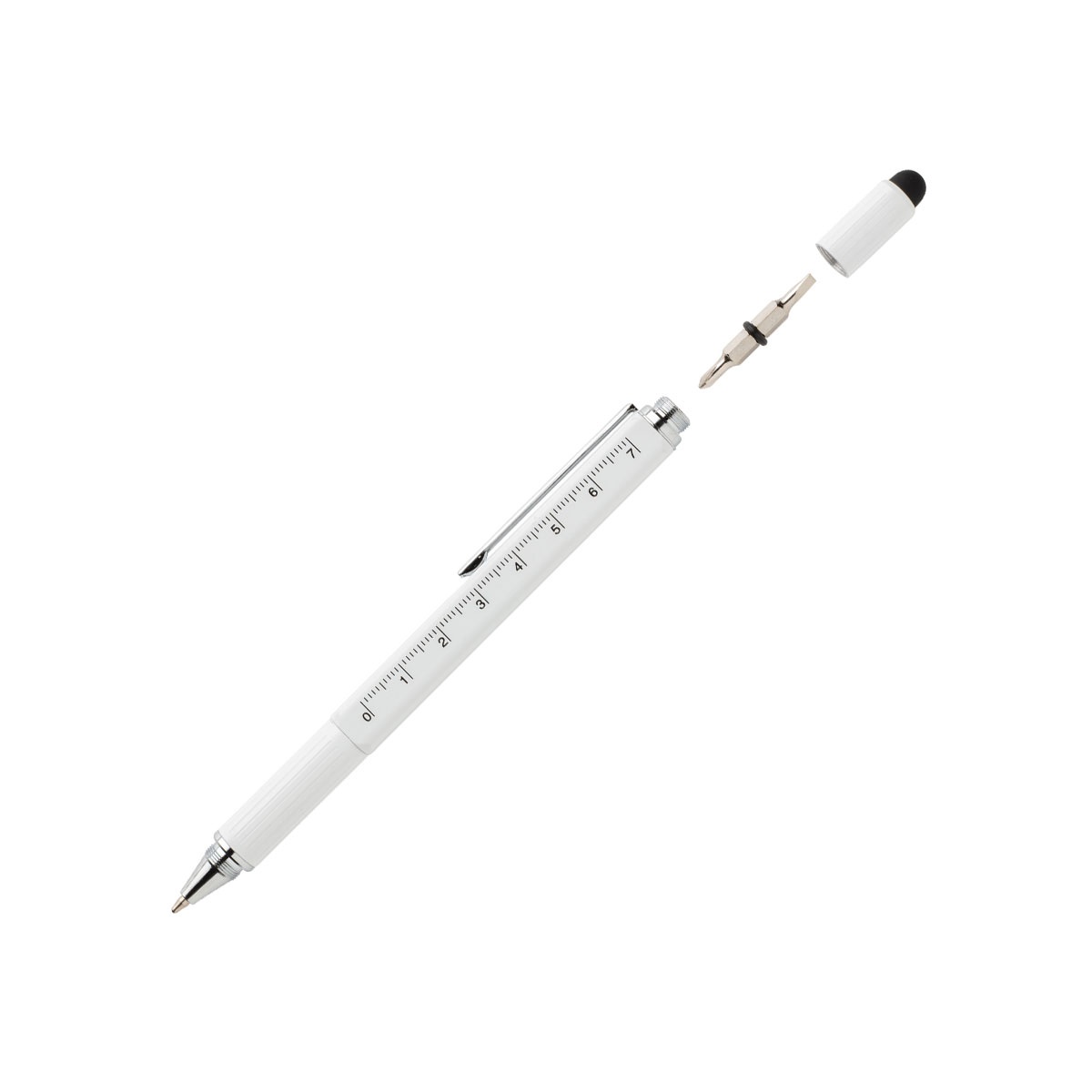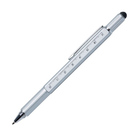 Den smarta reklampennan Tool är en Multifunktionell penna med linjal (7cm), vattenpass, skruvmejsel, stylus och ballpoint-penna med blått bläck. Tillverkad av högkvalitativ mässing med aluminiumclip.
