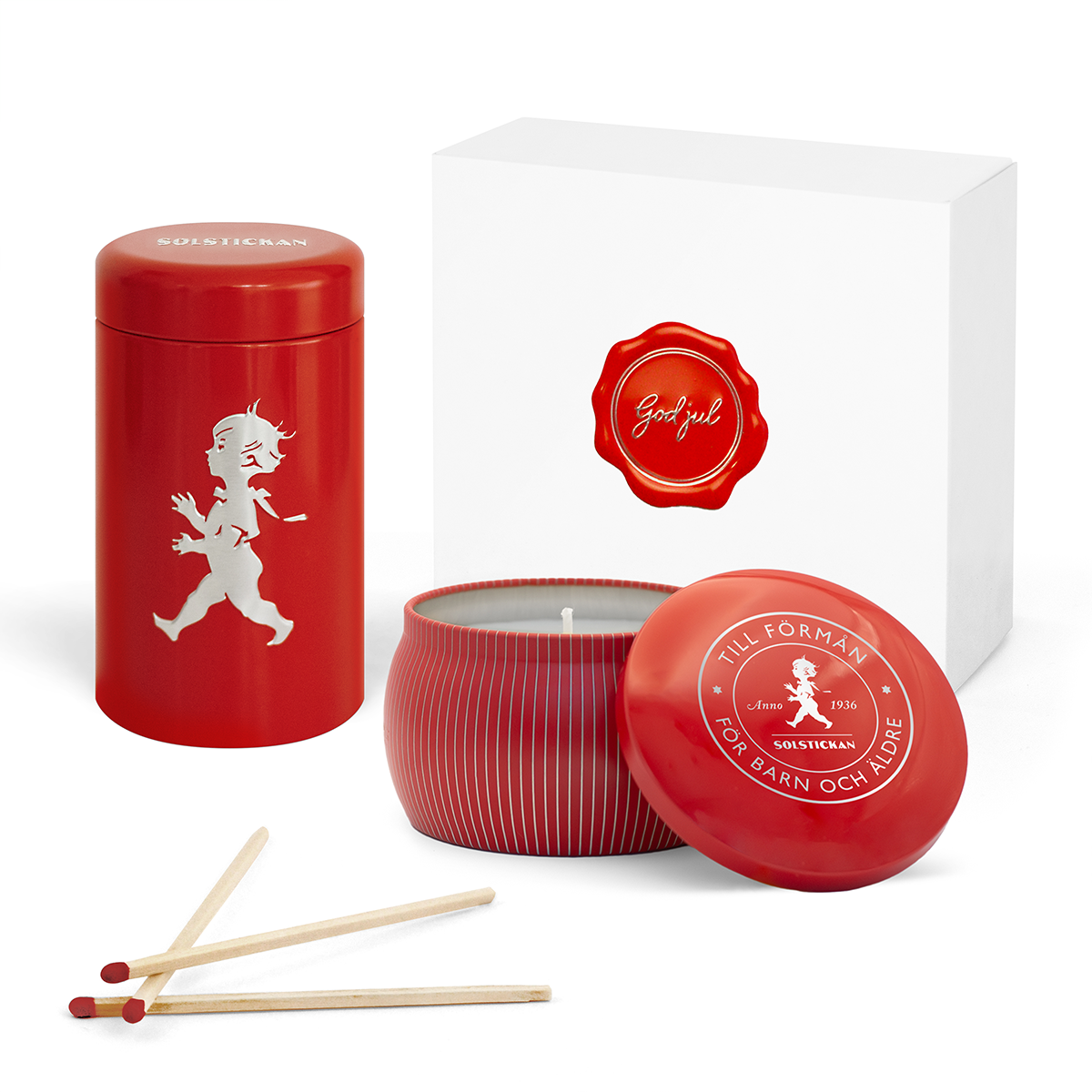 Ge bort lyxiga doftljus med matchande tändsticksrör från varumärket Solstickan. Doftljusen har en brinntid på ca 25 timmar. Välj bland fyra olika dofter. De gröna ljusen doftar barrskog, svarta ljusen doftar cederträ, vitt doftljus luktar eukalyptus och rött ljus doftar kanel och apelsin. Tändsticksrören är tillverkad i plåt och har den klassiska avbildningen av solstickepojken. Dofljuset och tändsticksröret levereras i en vacker presentlåda med en "god jul" sigill i aluminium. Perfekt för att skapa en stämningsfull jul!